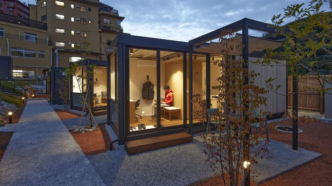 ホテル棟の空間は一般のお客様が入れない専用空間となっており、一歩踏み入れると温泉街とは思えないプライベートリゾートのような空間。コンテナはそれぞれ独立しておりプライベート空間も確保。